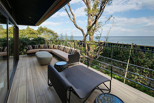 151㎡のゆったりとした空間を確保したドッグフレンドリーヴィラは、光を取り込む大きな窓が印象的なリビングをはじめとして、滞在中多目的に使用できる和室、ツインベッドルーム、屋外家具を配した開放的な専有露天風呂付ウッドデッキテラスからなる、三世代旅行でも満足できるラグジュアリースイートです。